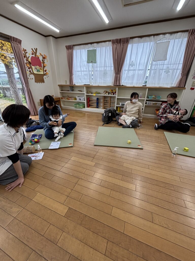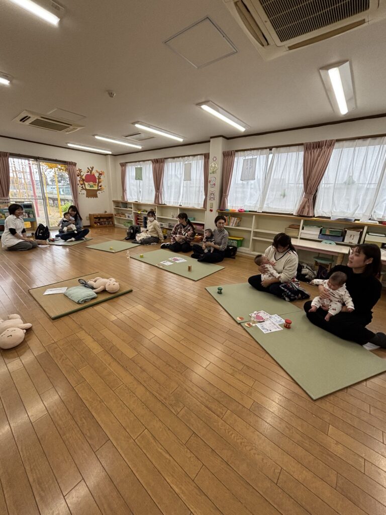 看護士の長谷川先生によるベビーマッサージ。お腹をマッサージしながら「便秘していないかな?」など一人ひとりに声を掛け、子ども達に寄り添いながら優しく教えて頂きました。参加したお母様方もリラックスした表情で和やかな雰囲気の中、離乳食の話など楽しそうな交流が見られました。