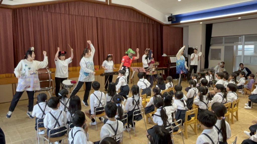 10月の先生達のプレゼントは、楽しいコンサート!先生達が可愛らしい姿に変身して楽器の演奏やダンスを披露してくれました。楽しい空間で子ども達もみんなで笑顔いっぱいでした。